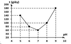 Nhóm học sinh 12N01 ghi lại kết quả thời gian t (giây) mà tinh bột thủy phân hết trong môi trường pH = 5; 6; 7; 8; 9 và vẽ đồ thị như hình bên.