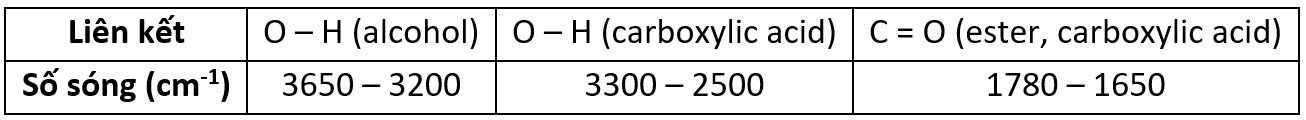 Sau thí nghiệm, tiến hành phân tách sản phẩm. Ghi phổ hồng ngoại của acetic acid, isoamyl alcohol và isoamyl acetate. Cho biết số sóng hấp thụ đặc trưng của một số liên kết trên phổ hòng ngoại (IR) như sau: