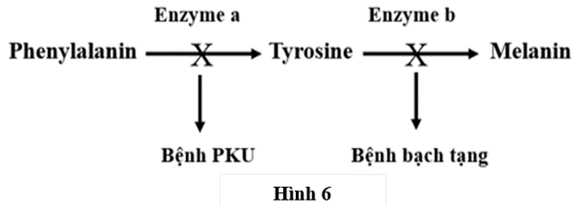 Sơ đồ hình 6 mô tả rút gọn con đường chuyển hoá phenylalanin liên quan đến hai bệnh chuyển hoá ở người, gồm phenylketonuria (PKU) và bạch tạng. Allele A mã hóa enzyme A xúc tác chuyển hóa phenylalanin thành tyrosine, allele đột biến lặn a không có khả năng này dẫn tới tích luỹ phenylalanine gây bệnh PKU. Allele B mã hóa enzyme B xúc tác chuyển hóa tyrosin thành melanin, allele đột biến lặn b không có khả năng này dẫn tới tyrosine không được chuyển hóa thành melanin và gây bệnh bạch tạng. Hai gen mã hóa enzyme A và enzyme B nằm trên 2 cặp NST tương đồng khác nhau. Tyrosine có thể được thu nhận trực tiếp một lượng nhỏ từ thức ăn.