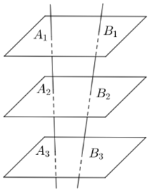 Cho ba mặt phẳng \(\left( P \right),\,\,\left( Q \right),\,\,\left( R \right)\) đôi một song song. Hai