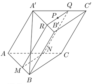 Cho hình lăng trụ \(ABC.A'B'C'\) có đáy là tam giác đều cạnh là 6cm. Gọi \(M,\,\,N\) là các điểm nằm trên các cạnh \(AB,\,\,AC\) thỏa mãn \(AM = AN = 4cm\), điểm \(P\) là trọng tâm của các tam giác \(A'B'C'\). Mặt phẳng \(\left( {MNP} \right)\) cắt các mặt của lăng trụ tạo thành một đa giác. Tìm số cạnh của đa giác đó.