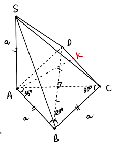 Cho hình chóp \(S.ABC\) có \(SA\) vuông góc với mặt phẳng đáy. Biết góc \(\angle {BAC} = {30^\circ }\), \(SA = a\) và \(BA = BC = a\). Gọi \(D\) là điểm đối xứng với \(B\) qua \(AC\). Khoảng cách từ \(B\) đến mặt phẳng \((SCD)\) bằng