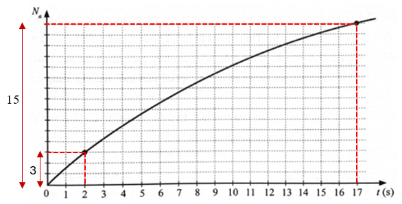 Một mẫu chất phóng xạ X phân rã theo thời gian và phát ra các hạt \(\alpha \). Số lượng các hạt \(\alpha \) này được ghi nhận bởi một máy thu (ống Geiger-Muller) và được biểu diễn theo thời gian t như đồ thị dưới.