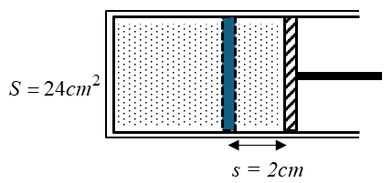 Một lượng không khí có thể tích 240cm3 bị giam trong một xilanh có pít – tông đóng kín như hình vẽ trên, diện tích của pít – tông là 24cm2, áp suất khí trong xilanh bằng áp suất ngoài là 100kPa. Cần một lực bằng bao nhiêu để dịch chuyển pít – tông sang trái 2cm? Bỏ qua mọi ma sát, coi quá trình trên đẳng nhiệt.