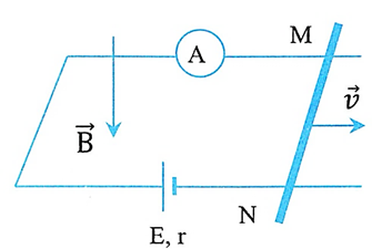 Cho mạch điện như hình vẽ, nguồn có suất điện động \(E = 1,2V\), điện trở trong \(r = 0,2\Omega \), thanh MN có chiều dài 0,8 m có điện trở \(R = 1,8\Omega \) có thể trượt trên các thanh ray như hình. Từ trường \(\overrightarrow B \) có phương thẳng đứng, hướng xuống và vuông góc với mặt khung như hình vẽ và \(B = 0,4T\). Bỏ qua điện trở của các thanh ray.