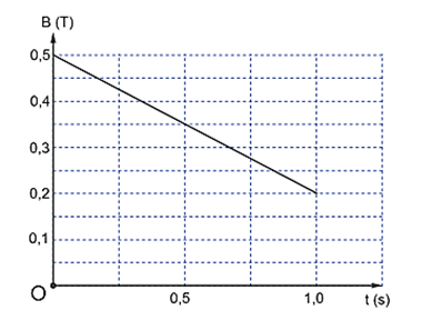 Một khung dây dẫn kín hình vuông có cạnh dài 10 cm gồm 500 vòng được đặt trong từ trường đều sao cho vector pháp tuyến của mặt phẳng khung dây cùng phương cùng chiều với vector cảm ứng từ. Điện trở suất và tiết diện của dây kim loại có giá trị lần lượt là \(\rho = {210^{ - 8}}\,\,\Omega m\) và \(0,4\,\,m{m^2}\). Giá trị cảm ứng từ biến thiên theo thời gian như đồ thị trong hình dưới đây.