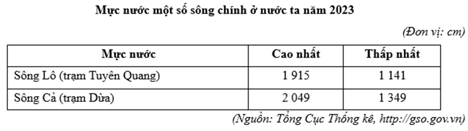 Căn cứ vào bảng số liệu trên, hãy cho biết năm 2023, sự chênh lệch mực nước cao nhất và mực nước thấp nhất của sông Lô tại trạm Tuyên Quang cao hơn so với sự chênh lệch mực nước cao nhất và mực nước thấp nhất của sông Cả tại trạm Dừa là bao nhiêu cm.