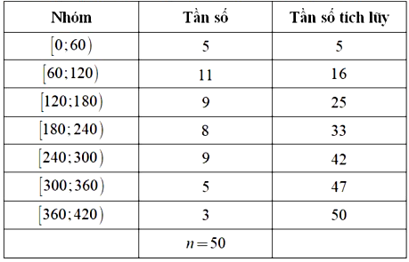 Giáo viên chủ nhiệm khảo sát thời gian sử dụng Internet trong một ngày của 50 học sinh thành 7 nhóm (đơn vị: phút) và lập bảng tần số ghép nhóm bao gồm cả tần số tích lũy như sau: