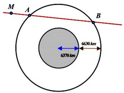 Các thiên thạch có đường kính lớn hơn 140 m và có thể lại gần Trái Đất ở khoảng cách nhỏ hơn 7500000 km được coi là những vật thể có khả năng va chạm gây nguy hiểm cho Trái Đất. Để theo dõi những thiên thạch này, người ta đã thiết lập các trạm quan sát các vật thể bay gần Trái Đất. Giả sử có một hệ thống quan sát có khả năng theo dõi các vật thể ở độ cao không vượt quá 6630 km so với mực nước biển. Coi Trái Đất là khối cầu có bán kính 6370 km . Chọn hệ trục tọa độ \(Oxyz\) trong không gian có gốc \(O\) tại tâm Trái Đất và đơn vị độ dài trên mỗi trục tọa độ là 1000 km . Một thiên thạch (coi như một hạt) chuyển động với tốc độ không đổi theo một đường thẳng từ điểm \(M\left( { - 12;29;10} \right)\) theo phương song song với giá của vectơ \(\vec u\left( { - 12;17;5} \right)\).