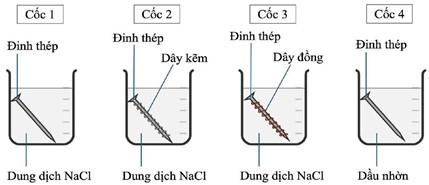 - Cho một đinh thép vào cốc 1 và cốc 4, cho đinh thép được quấn bởi dây kẽm (Zn) vào cốc 2, cho đinh thép được quấn bởi dây đồng (Cu) vào cốc 3 (các đinh thép là thép carbon thường và đã được làm sạch bề mặt).