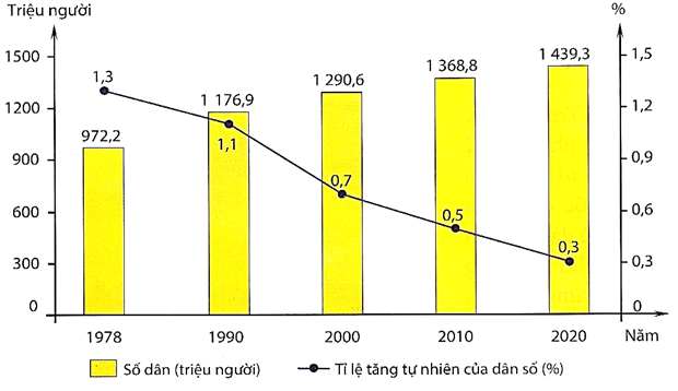 Biểu đồ số dân và tỉ lệ tăng tự nhiên của dân số Trung Quốc giai đoạn 1978 - 2020