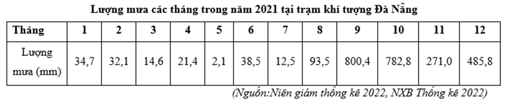 Căn cứ vào bảng số liệu trên, hãy cho biết tổng lượng mưa năm 2021 tại trạm khí tượng Đà Nẵng là bao nhiêu mm (làm tròn kết quả đến hàng đơn vị).