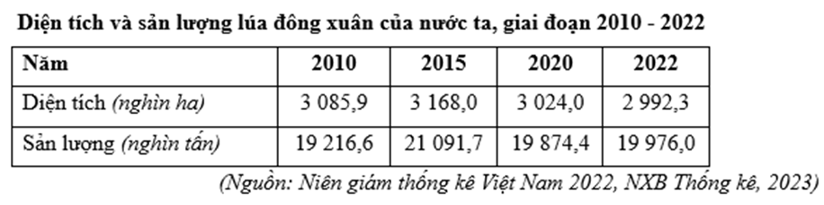 Căn cứ vào bảng số liệu trên, hãy cho biết năng suất lúa đông xuân của nước ta năm 2022 tăng lên bao nhiêu tạ/ha so với năm 2010? (làm tròn kết quả đến một chữ số thập phân).