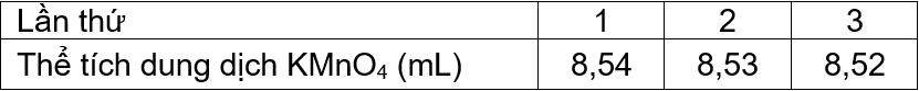 Chuẩn độ 10,00 mL dung dịch FeSO4 và H2SO4 loãng bằng dung dịch KMnO4 0,010 M. Kết quả thu được bảng như sau: