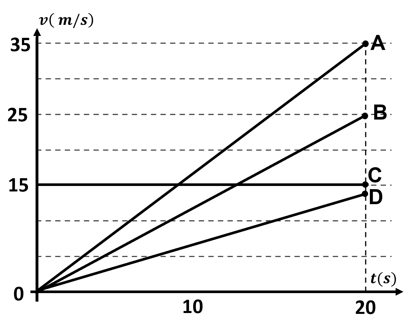 Đồ thị (v – t) của bốn xe ô tô A, B, C, D như hình. Xe có gia tốc nhỏ nhất là