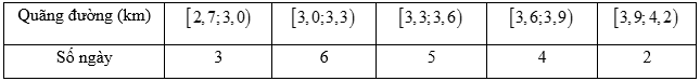 Quãng đường chạy bộ của Lan trong 20 ngày được thống kê như sau: Phương sai
