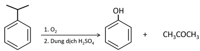 Phenol được tổng hợp từ cumene (isopropylbenzene) bằng phản ứng oxi hóa bởi oxygen rồi thủy phân trong môi trường acid thu được hai sản phẩm là phenol và acetone theo phương trình hóa học sau: