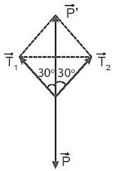 Một cái đèn được treo vào hai sợi dây giống nhau như vẽ. Biết khối lượng của đèn là 3kg, hai dây làm thành góc \({60^0}\). Xác định lực căng của mỗi dây. Lấy \(g = 10m/{s^2}\).