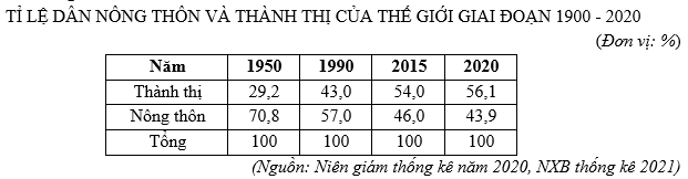 Theo bảng số liệu, để thể hiện sự chuyển dịch cơ cấu dân số phân theo thành thị và nông thôn giai đoạn 1950 - 2020, biểu đồ nào sau đây thích hợp nhất?