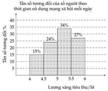 Một doanh nghiệp sản xuất xe ô tô khảo sát lượng xăng tiêu thụ trên 100 km của một số loại xe ô tô trên thị trường. Kết quả khảo sát 100 chiếc xe được biểu diễn trong hình dưới đây.