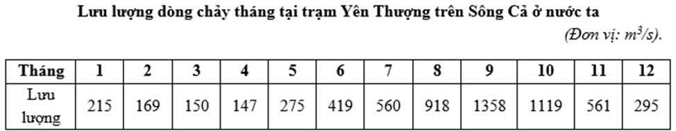 Căn cứ vào bảng số liệu trên, hãy cho biết lưu lượng dòng chảy trung bình năm tại trạm Yên Thượng trên Sông Cả ở nước ta là bao nhiêu m3/s (làm tròn kết quả đến hàng đơn vị).