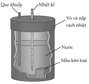 Một nhóm học sinh làm thí nghiệm để xác định nhiệt dung riêng của một mẫu kim loại. Họ có một bình xốp hình trụ có vỏ và nắp cách nhiệt, một que khuấy, một nhiệt kế, mẫu kim loại, một chiếc cân và một bình đun nước. Ban đầu, mẫu kim loại được để ở nhiệt độ phòng (27,00C).