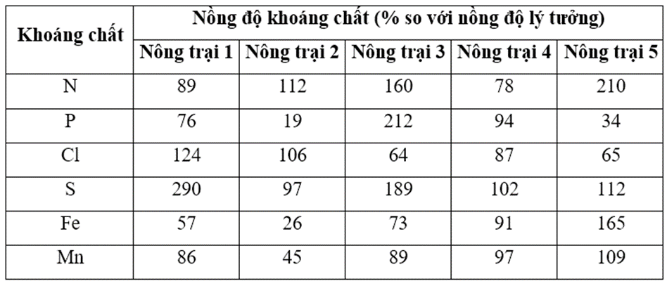 Người ta thu thập mẫu đất của 5 trang trại khác nhau và mang về phòng thí nghiệm để nghiên cứu. Đất được làm khô sau đó được pha thành 1L mẫu thử nghiệm. Để đảm bảo rằng không có khoáng chất nào bị giữ lại trong chất hữu cơ của đất, mẫu đất được nung nóng ở nhiệt độ 500 oC trong 20 phút, tro của chất hữu cơ được loại bỏ và phần đất còn lại được phân tích nồng độ các loại khoáng chất khác nhau. Kết quả phân tích được trình bày dưới dạng phần trăm của nồng độ lý tưởng trong bảng 2: