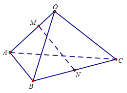 Cho tứ diện \(OABC\) có \(\angle {AOB} = \angle {BOC} = 60^\circ ;\,\,\angle {AOC} = 90^\circ \); \(OA = OB = OC = 1\). \(M\) là điểm thuộc cạnh \(OA\)sao cho \(AM = 2.MO\); \(N\) là trung điểm \(BC\). Tính độ dài vectơ\(\overrightarrow {MN}\).