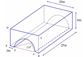 Một công ty dự tính làm thủy cung nhằm phục vụ khách du lịch. Thủy cung có dạng hình một khối hộp chữ nhật không nắp, trong đó lối đi hình vòng cung ở dưới là một phần của khối trụ tròn xoay (như hình vẽ). Biết rằng thủy cung có phần vòng cung làm bằng kính cường lực dày \(12mm\), phần còn lại dày \(15mm\)với đơn giá \(500.000\) đồng trên \(1{m^2}\)kính \(12mm\)và \(600.000\)đồng cho kính \(15mm\). Số tiền (đồng) để làm bể cá đó là _________ (làm tròn đến hàng đơn vị).