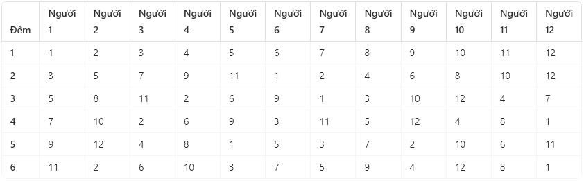 Một nhóm 12 người tham gia chuyến du lịch dài ngày và thuê 12 căn lều cạnh nhau. Hằng đêm, họ quyết định đổi lều sao cho: Không ai ở lại lều đã ở đêm trước và 2 người bất kì không ở phòng cạnh nhau quá 1 đêm. Hỏi nhóm người có thể đổi lều nhiều nhất bao nhiêu đêm?
