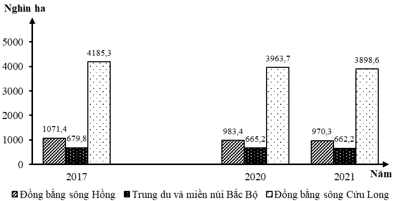 Cho biểu đồ: Diện tích lúa một số vùng nước ta, năm 2017, 2020 và 2021 (Số liệu theo Niên