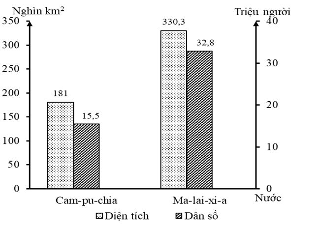 Cho biểu đồ: Diện tích và dân số của Cam-pu-chia và Ma-lai-xi-a năm