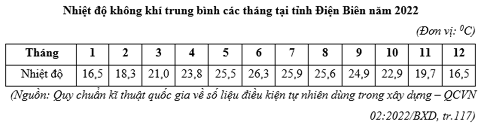 Căn cứ vào bảng số liệu trên, cho biết nhiệt độ không khí trung bình năm của tỉnh Điện Biên năm 2022 là bao nhiêu ℃? (làm tròn kết quả đến một chữ số thập phân).