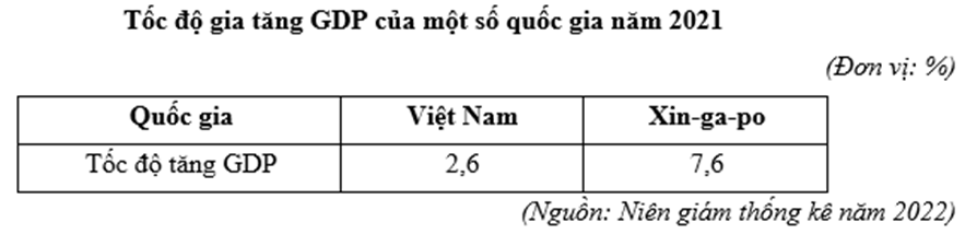 Căn cứ vào bảng số liệu trên, cho biết tốc độ tăng GDP của Xin-ga-po năm 2021 cao gấp bao nhiêu lần của Việt Nam (làm tròn kết quả đến một chữ số của phần thập phân).