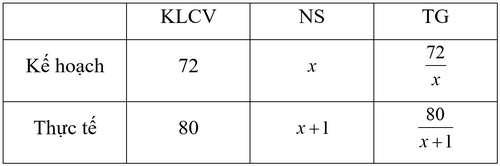 Từ đề bài ta có phương trình: \(\dfrac{{80}}{{x + 1}} - \dfrac{{72}}{x} = \dfrac{{12}}{{60}} = \dfrac{1}{5}\)
