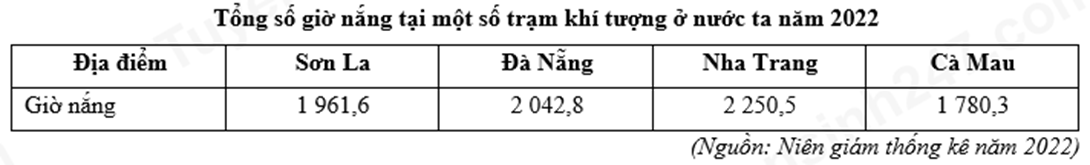 Căn cứ vào bảng số liệu trên, cho biết chênh lệch tổng số giờ nắng giữa hai địa điểm lớn nhất là bao nhiêu giờ (làm tròn kết quả đến hàng đơn vị).
