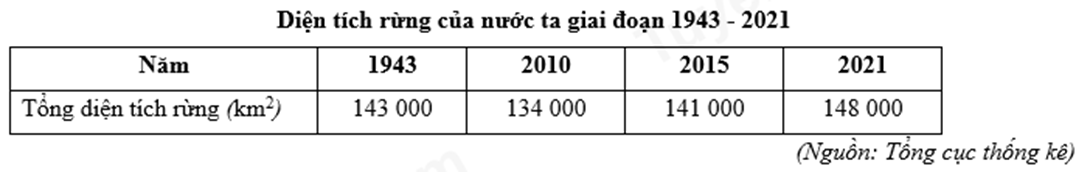 Cho bảng số liệu: Căn cứ vào bảng số liệu trên, cho biết độ che phủ rừng của
