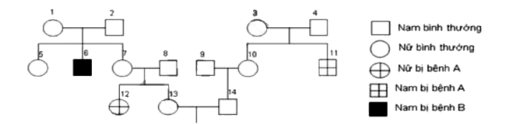 Cho biết mỗi bệnh do 1 trong 2 allele của 1 gene quy định, các gene phân li độc lập, người số 9 mang allele gây bệnh A, người số 2 không mang allele gây bệnh B. Theo lí thuyết, xác suất sinh con gái đầu lòng dị hợp 1 cặp gene của cặp 13-14 là bao nhiêu %?