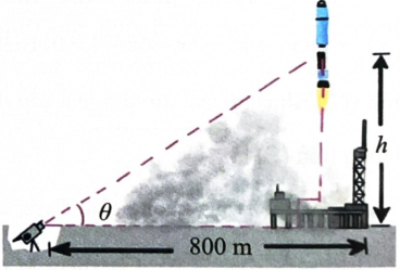 Một camera truyền hình đặt ở mặt đất đang quay cảnh phóng một tên lửa tại một điểm cách bệ phóng 800 m . Gọi \(\theta \) là góc nâng của camera so với phương ngang và \(h\) là độ cao tên lửa (xem hình vẽ). Khi tên lửa ở độ cao 200 m và đạt tốc độ \(1,7{\rm{\;km}}/{\rm{s}}\) thì góc nâng camera \(\theta \) đang có vận tốc góc \({\rm{rad}}/{\rm{s}}\). Khi \(\theta = \dfrac{\pi }{4}\) và có vận tốc góc \(\theta ' = 2,5{\rm{rad}}/{\rm{s}}\) thì vận tốc của tên lửa là km/s.