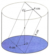 Một chiếc cốc hình trụ có chiều cao gấp hai lần bán kính đáy. Bạn An nhận thấy nếu đặt nằm nghiêng vào cốc một miếng kim loại hình chữ nhật kích thước 8 cm thì thấy hai cạnh 4 cm của hình chữ nhật khít với hai dây cung của đáy cốc và miệng cốc (tham khảo hình vẽ). Diện tích của đáy cốc bằng _____ \(\pi {\rm{c}}{{\rm{m}}^2}\).