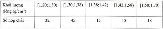 Khối lượng riêng \(\left( {{\rm{g}}/{\rm{c}}{{\rm{m}}^3}} \right)\) của 125 hợp chất hóa học được đưa ra trong bảng sau: