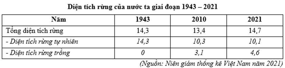 | c) Trong giai đoạn 1943 – 2021, diện tích rừng tự nhiên tăng nhanh hơn diện tích rừng trồng. | ||
