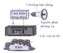 Hình vẽ mô tả sơ đồ hoạt động đơn giản hoá của cảm biến báo khói ion hoá. Nguồn phóng xạ \(\alpha \) americium \(_{95}^{241}{\rm{Am}}\) có hằng số phóng xạ \(5,{081.10^{ - 11}}\;{{\rm{s}}^{ - 1}}\) được đặt giữa hai bản kim loại kết nối với một pin. Các hạt \(\alpha \) phóng ra làm ion hoá không khí giữa hai bản kim loại, cho phép một dòng điện nhỏ chạy giữa hai bản kim loại đó và chuông báo không kêu. Nếu có khói bay vào giữa hai bản kim loại, các ion trong này sẽ kết hợp với những phân tử khói và dịch chuyển chậm hơn làm cường độ dòng điện chạy giữa hai bản kim loại giảm đi. Khi dòng điện giảm tới mức nhất định thì cảm biến báo khói sẽ gửi tín hiệu kích hoạt chuông báo cháy.