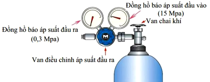 Bình oxy y tế là một thiết bị rộng rãi cho những cho những người bệnh có bệnh lý về đường hô hấp. Khí oxy trong bình có áp suất lớn, nên để bệnh nhân có thể sử dụng được ta phải giảm áp suất khí oxy. Hình bên là mô tả van điều áp ở bình oxy y tế. Nếu liều lượng khí oxy bệnh nhân sử dụng được bác sĩ chỉ định là 5 lít/phút thì lưu lượng khí oxy đầu vào trước khi giảm áp là (coi lưu lượng khí oxy là nhiệt độ là không đổi. Khí oxy là khí lí tưởng và tinh khiết 100%)