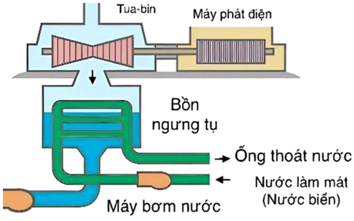 Các nhà máy điện hạt nhân thường được xây dựng cạnh hồ, sông và bờ biển vì nhà máy điện hạt nhân toả ra rất nhiều nhiệt, cần nhiều nước để làm mát và ngưng tụ hơi nước sau khi đi qua tua bin máy phát điện. Hình bên là sơ đồ hệ thống ngưng tụ hơi nước, trong 1 h đã có \(1000\,\,{m^3}\) nước biển đi qua bồn ngưng tụ. Độ chênh lệch nhiệt độ giữa nước biển đầu vào và đầu ra có giá trị ổn định là \({40^0}C\). Cho nhiệt dung riêng của nước biển là 3900 (J/kg.K), khối lượng riêng của nước biển là \(1030\,\,\left( {kg/{m^3}} \right)\), nhiệt hóa hơi riêng của nước là \(2,{3.10^6}\,\,\left( {J/kg} \right)\), nhiệt độ của hơi nước là \({100^0}C\) và chỉ có 60% lượng nhiệt truyền cho nước biển là của hơi nước. Trong khoảng thời gian trên lượng hơi nước đã bị ngưng tụ là \(x{.10^3}\,\,kg\). Tìm x (kết quả làm tròn đến 1 chữ số sau dấu phẩy thập phân)