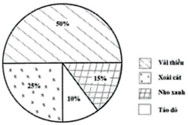 Biểu đồ ở hình bên cho biết tỉ lệ khối lượng các loại quả bán được trong ngày Chủ nhật của một cửa hàng. Biết khối lượng Nho xanh bán được là 24kg. Khối lượng Vải thiều bán được là bao nhiêu?