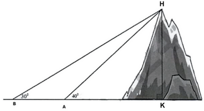 Từ hai địa điểm \(A,\,\,B\) người ta cùng nhìn thấy một đỉnh núi với góc nâng lần lượt là \(40^\circ \) và \(30^\circ \) (như hình vẽ). Biết khoảng cách giữa hai địa điểm \(A,\,\,B\) là 600m. Tính chiều cao của ngọn núi? (Kết quả tính theo đơn vị mét và làm tròn đến chữ số hàng đơn vị).