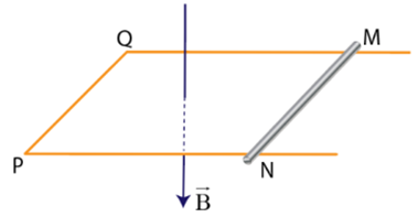 Hình bên biểu diễn một thanh dẫn điện MN trượt trên hai thanh kim loại theo chiều vuông góc với cảm ứng từ. Biết B = 0,40T, MN = PQ = 0,20m. Thanh MN đang chuyển động về bên trái với vận tốc có độ lớn 0,2m/s và có hướng vuông góc với nó. Toàn bộ mạch điện có điện trở 2,0Ω. Các thanh kim loại không nhiễm từ, bỏ qua ma sát.