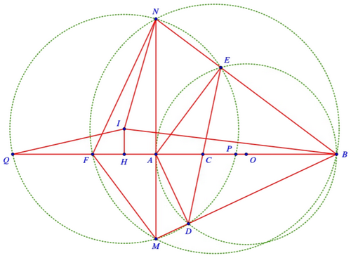 b) Gọi \(F\) là giao điểm thứ hai của đường tròn ngoại tiếp tam giác \(BMN\) và đường thẳng \(AB\). Chứng minh rằng \(F\) là điểm cố định và tích \(AM.AN\) không đổi khi dây cung \(DE\) của đường tròn \(\left( O \right)\) thay đổi.