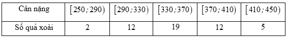Bảng thống kê cân nặng của 50 quả xoài được lựa chọn ngẫu nhiên sau khi thu hoạch ở nông trường như sau